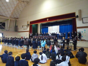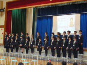 次は校長先生のお話、、、、の予定でしたが6年生からみんなへの感謝の気持ちをこめてサプライズで「夢の世界へ」の合唱の発表がありました。