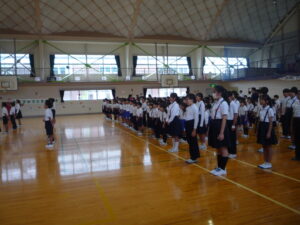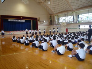 全校のみんなは5年生の話をよく聞いて練習に臨んでいました。