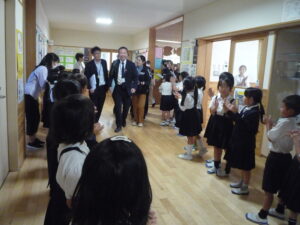 田中っ子は初めて会う坂の上小の子供たちに興味深々で、笑顔で歓迎しました。