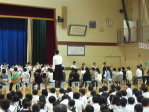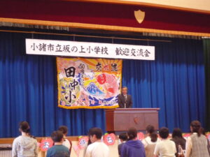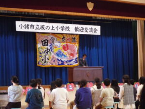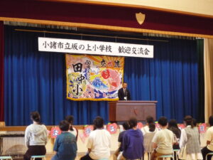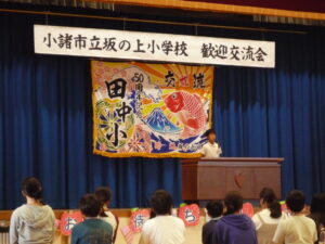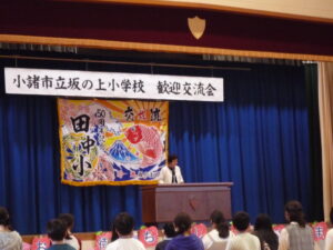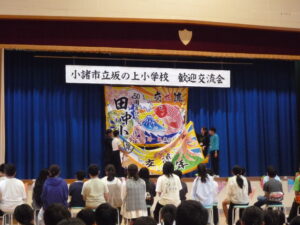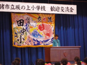 記念品贈呈では、田中小から坂の上小へ交流50周年の記念として、旗がおくられました。坂の上小からは小諸市に訪れた時に、ステージ上に飾られている、交流記念旗をいただきました。