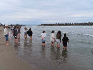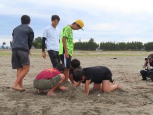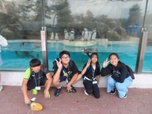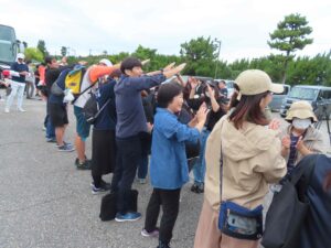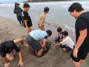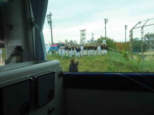 岩瀬浜に行く途中、田中小学校のグラウンド横を通りました。坂の上小学校の友達を歓迎する野球部の姿にも感動!伝統は、様々な場面で引き継がれていることを感じました。