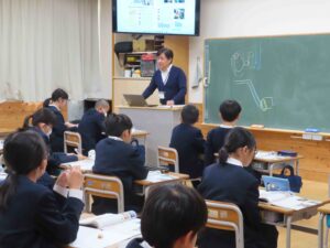 社会科の学習の時間に、早月川発電所を見学した感想を紹介していました。「水の力で発電していたところがすごい」「タービンがものすごい速さで回転していた」「水が落ちる落差が発電の力を高めていると分かった」「CO2の削減や節電に心がけたい」等、感想を踏まえ、環境学習や暮らしを支える工業生産の学習につなげていました。見学して学んだことを学習につなげ、関心や理解を深めていました。