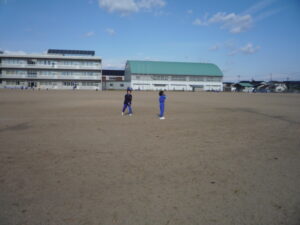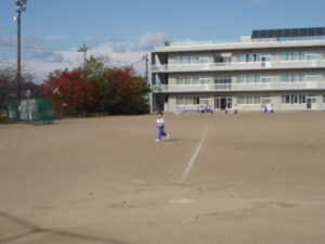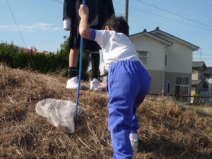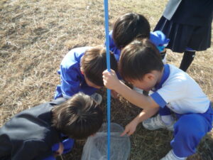 1年生が虫取り網をもってグラウンドにいます! どうやらとんぼを捕まえたいみたいです!