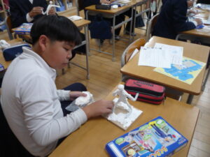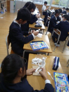 こちらは6年生の図工の様子です。未来の自分を作っています。同じテーマでも表現が巧みでひとりひとり全然違うものに仕上がってきています。見ているととても楽しくて何か話しかけてきそうな雰囲気です。未来の自分に魂を吹き込む6年生は真剣そのものです。