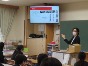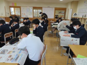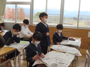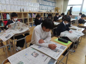 6年生が、新聞はどのように構成されているのかを学んだり、記事の見方について学んだりしました。何を伝えたいかによって、見出しの表現が異なることを知り、新聞への関心が高まりました。早速、朝刊を使って、気になった記事をスクラップしていました。