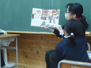 今日は、クリスマスに関する本や、普段は貸し出しがない大きな本を読んでくださいました。子供たちは、「きつねさんがみんなとそっくりな木彫りを作っていてすごいな」「これがくじらかぁ!」ととても楽しそうに聞き入っていました。