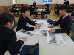 「橋場をにぎわった様子にしたいから水彩画で温かみのあるものにしたいと思った」「中滑川駅前をもっとにぎやかにしたいと思い、お祭りをしていた様子にしてみた」など、自分の思いを紹介し合いました。