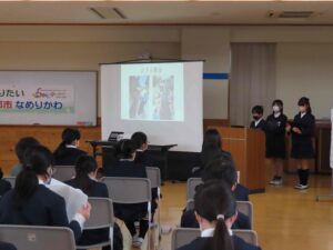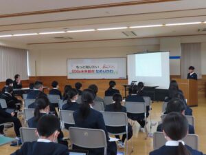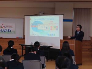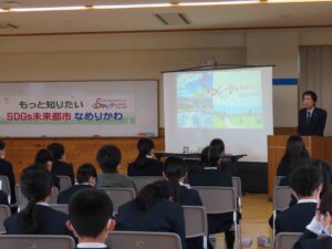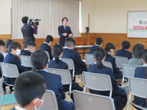 5年生の報告後、水野市長さんから環境の視点から、市で取り組んでいるSDGsの取組を教わりました。最後の質問や感想タイムでは、上流から流れてきたゴミが海岸沿いに多いことやペットボトルや釣り針、空き缶や木くずなどのごみが多いこと、清掃活動ではボランティアの人数にもよるが20から30のごみ袋分のごみを回収していること、藻場を増やすための具体的な原因追究調査について理解を深めました。そして、スーパーでは過剰包装ではないものを購入したりエコバックを使用したりしたいといった感想を発表していました。