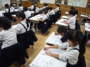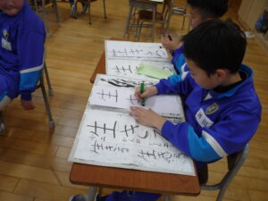 1年生「こうま」初めての書き初め大会。一画一画丁寧に書きました。