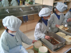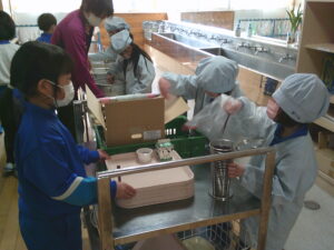 給食の配膳が上手になった1年生です。この日は納豆でした。