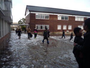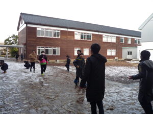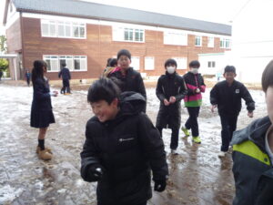 天気が良く雪はほとんどとけてしまいまが、まだ少し残っている雪で6年生は雪合戦をしています。