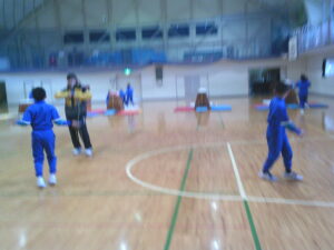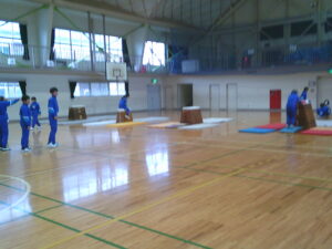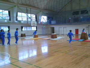 黙々と跳び箱に取り組む子供たちです。「一番高い跳び箱でも台上前転でだったら跳べました」という児童もいました。小学校1年生ぐらいの背の高さの跳び箱を軽々とんでいる児童もいて、下学年の跳び箱遊びからの積み重ねを感じました。