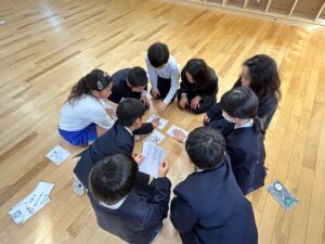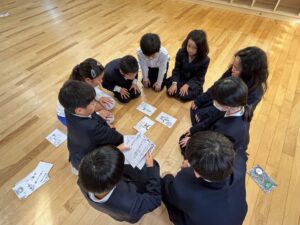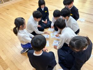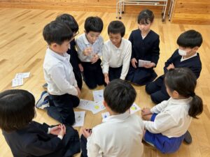 完成したかるたでグループごとにかるた取りをすると、「はい!」「あった!」と元気な声が教室いっぱいに広がり、大盛り上がりのかるた大会になりました。