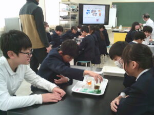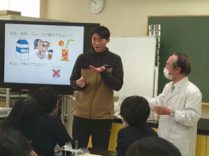 健康3原則(食事・運動・睡眠)で病気をなおす力を高めること、薬は「きまり」を守って使うこと、薬物乱用は絶対にしてはいけないことを学びました。お茶やジュースを使い、薬が変化してしまうことも、実験を通して理解を深めました。身近な薬の正しい使い方を学ぶとともに、違反薬物を1回使うだけでも脳が壊れてしまい、元に戻らないことを教わりました。スーパーコンピュータ富岳よりすごい自分たちの脳を守るためにも、乱用してはいけないとの話からも、薬の怖さや正しく使うことの大切さを学びました。
