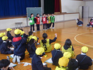 1月30日(金)の2・3・4時間目に、体育館で冬の集会が行われました。4~6年生がスキー教室へ行くのに合わせて、3年生が集会を企画し、1~3年生で楽しみました。準備の段階では、「○○は難しいから、1年生が楽しめないかもしれないよ」「○○なルールにすると、みんなが楽しいと思うよ」など、1・2年生のことを考えながら話合いを重ねてきました。感想タイムでは、「楽しかった」という意見がたくさん聞かれました。また、3年生の振り返りでは、「大変だったけどやってよかった」「低学年の人たちの笑顔を見ることができて嬉しかった」と、達成感を味わっていました。