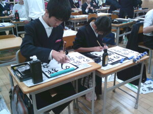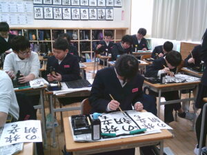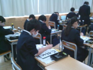 卒業を間近に迎えた6年生にふさわしい言葉でした。5文字を書く課題は大変難しいですが、はね、はらいに気を付けて一画一画丁寧に筆を運びました。
