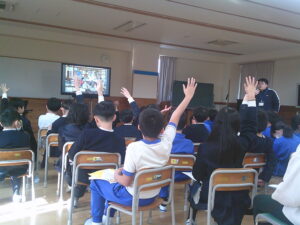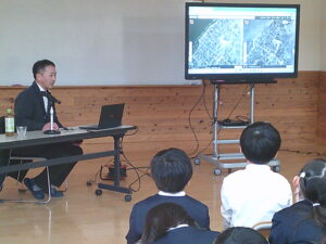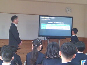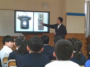 3年生が社会科の学習で、滑川市博物館の近藤館長さんから、「市の移り変わりと昔の暮らし」について教えていただきました。道具が変わると暮らしが変わることや、家族構成が変わると世帯数も随分変わり、田中校区も田んぼから宅地が増えていることを知りました。「昔、〇〇があった場所ですよ」と地図を見ながら話を聞き、驚きの連続でした。