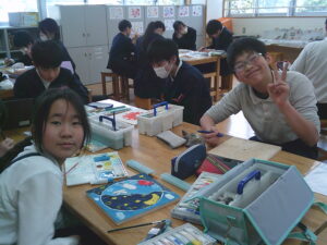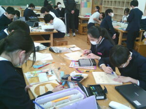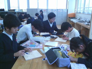 木の板に、思い思いの絵を描き、彫刻刀で彫り進め、着色をしていました。