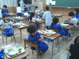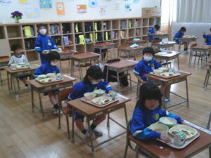 24日(金)、1年生は給食の準備も食べるのも早くなりました。しかもほとんど残食がないのでうれしいです。今日は6Pチーズが出ました。当番の子がお休みだったことに気付いた子もいました。「〇〇ちゃんがお休みだから、△△さんの給食を作る人がいないよ」と話してくれ、「わたしがやります」とすぐに言ってくれました。そんな優しいまま大人になってほしいですね。