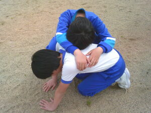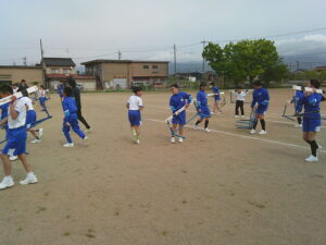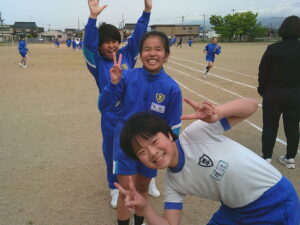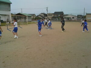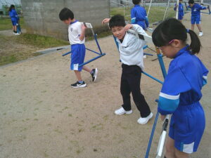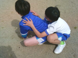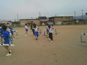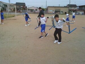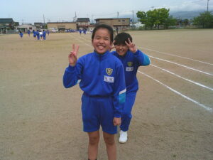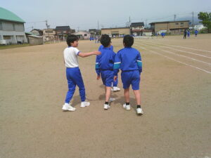 その頃、5、6年生は外で体育です。「先生!バースデーラン、しましょう!」と誘ってくれました。(ちなみに朝からはしゃぎすぎて足が痛かった私の手をつなぎ引っ張ってくれ100mやっと走れました)